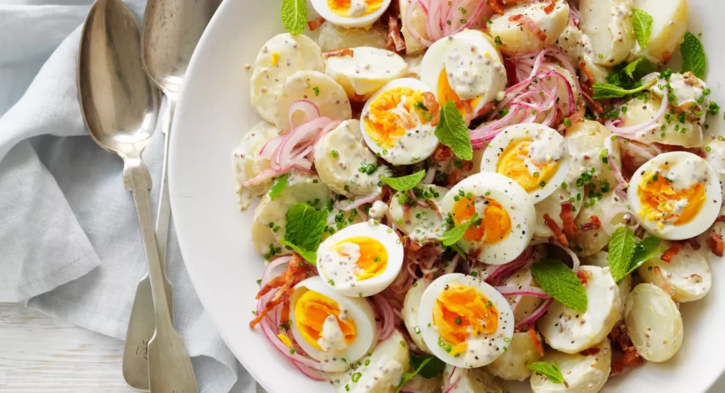 Creamy, tangy and packed with texture, this potato salad is a brilliant side for grilled meats and BBQ spreads. The quick pickled onion adds brightness, while crispy bacon and egg make it feel hearty without being heavy.